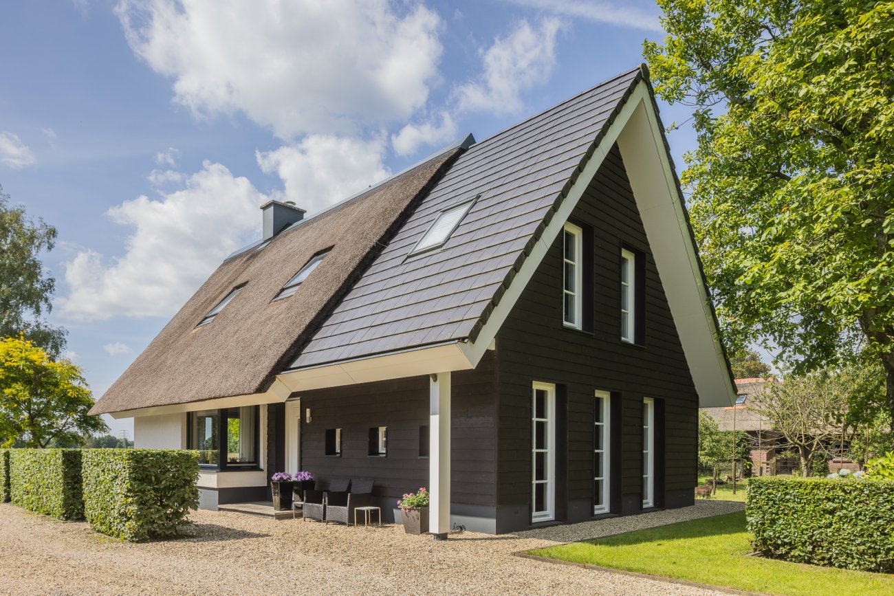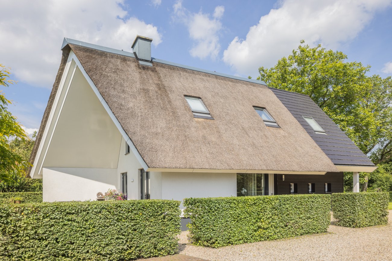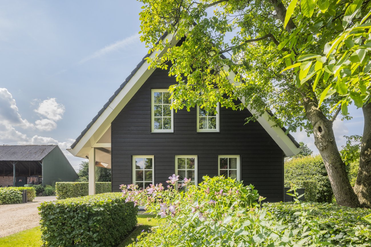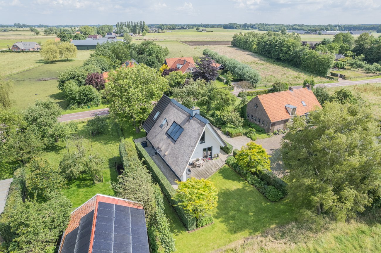 De bestaande boerderij op het erf was in een zeer slechte staat en heeft daarom plaatsgemaakt voor een nieuwe woning. De woning heeft twee 'gezichten', aan de straatzijde een landelijke uitstraling met houten gevelbekleding en aan de achterzijde een moderne uitstraling met gevelstuc en een imposant uitstekende dakconstructie.
