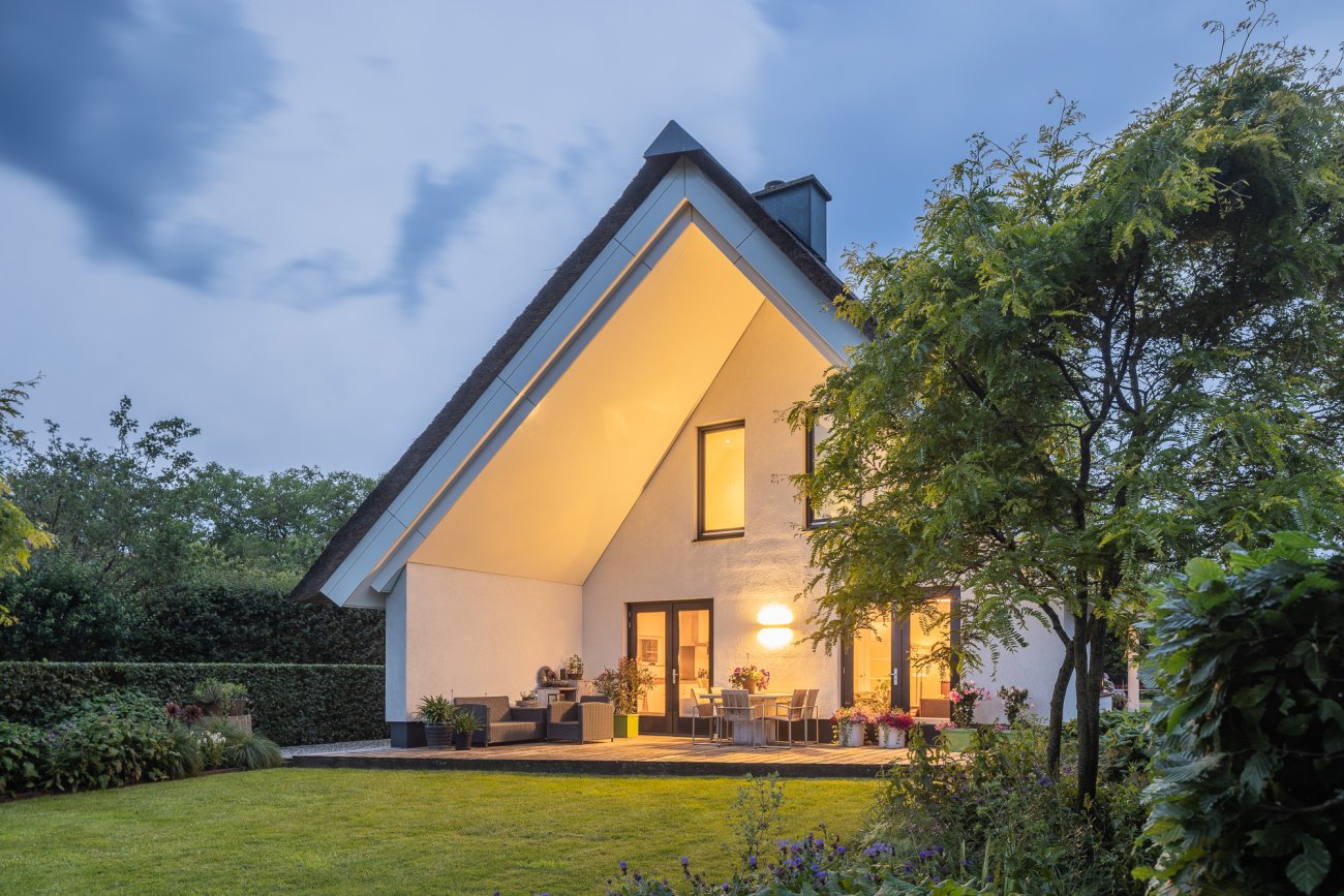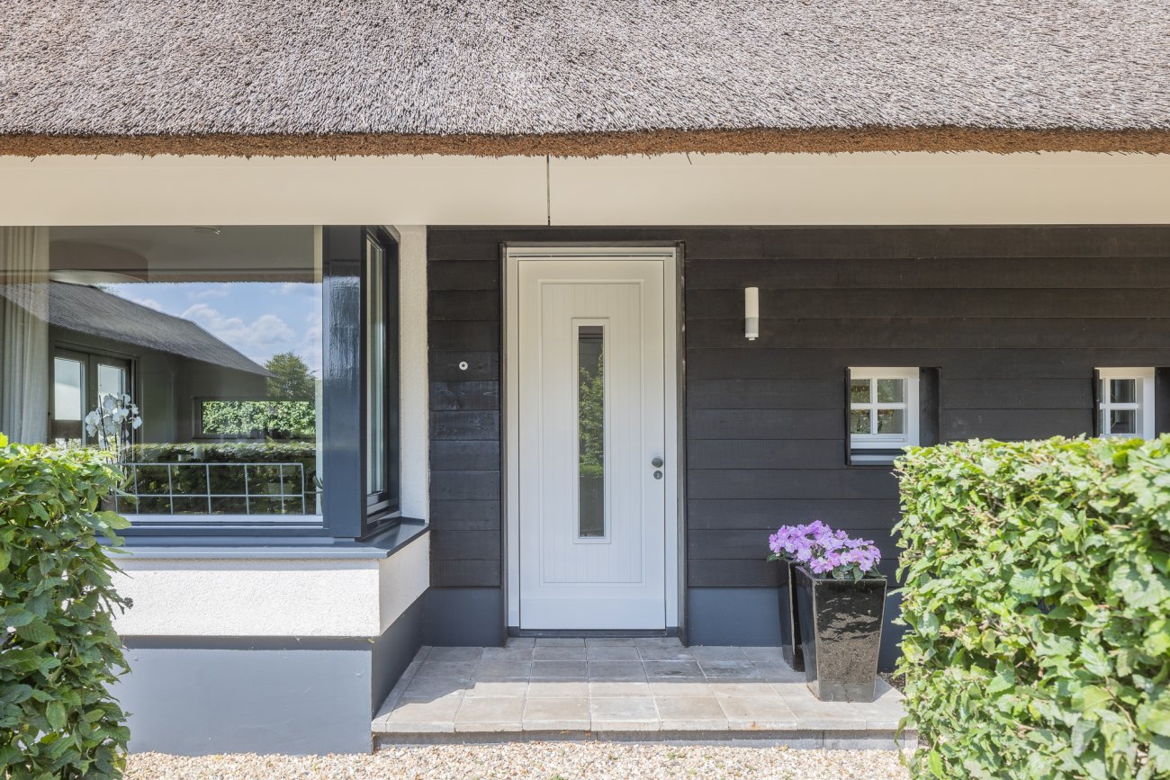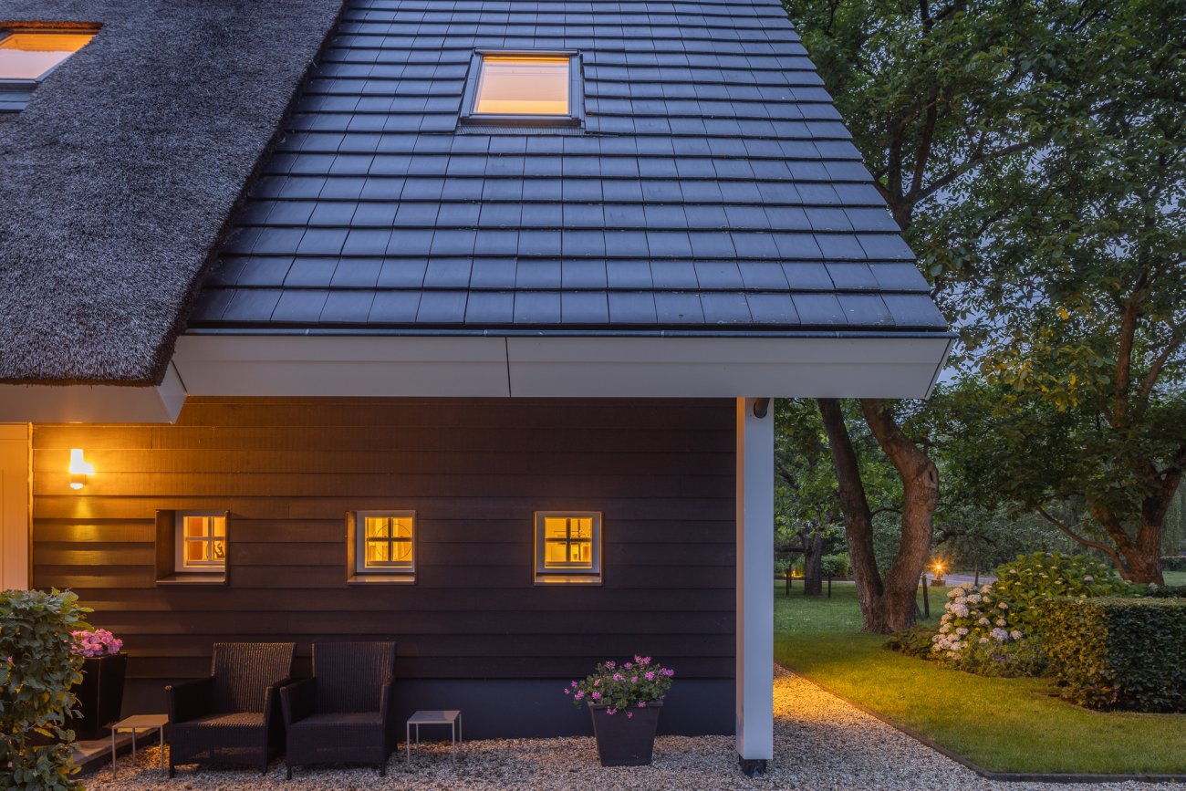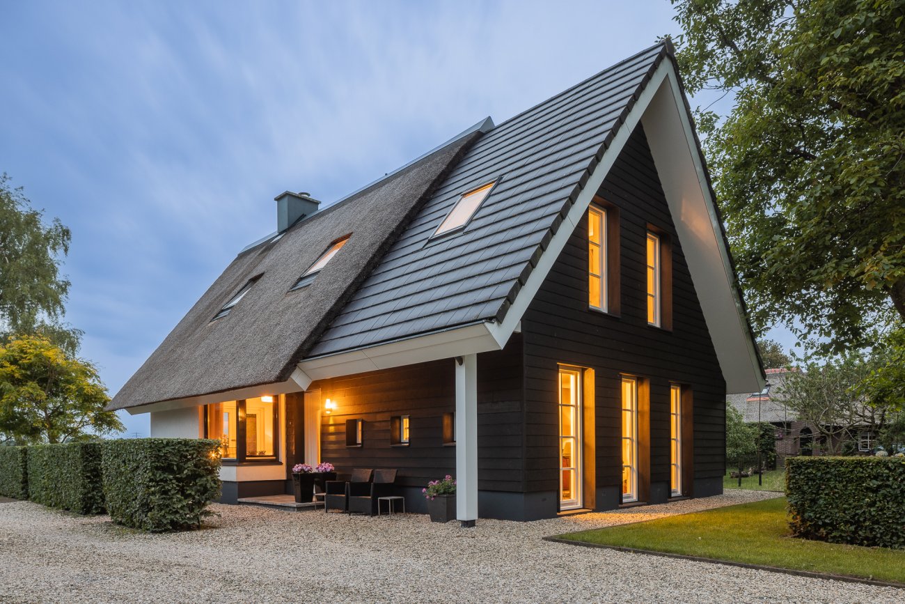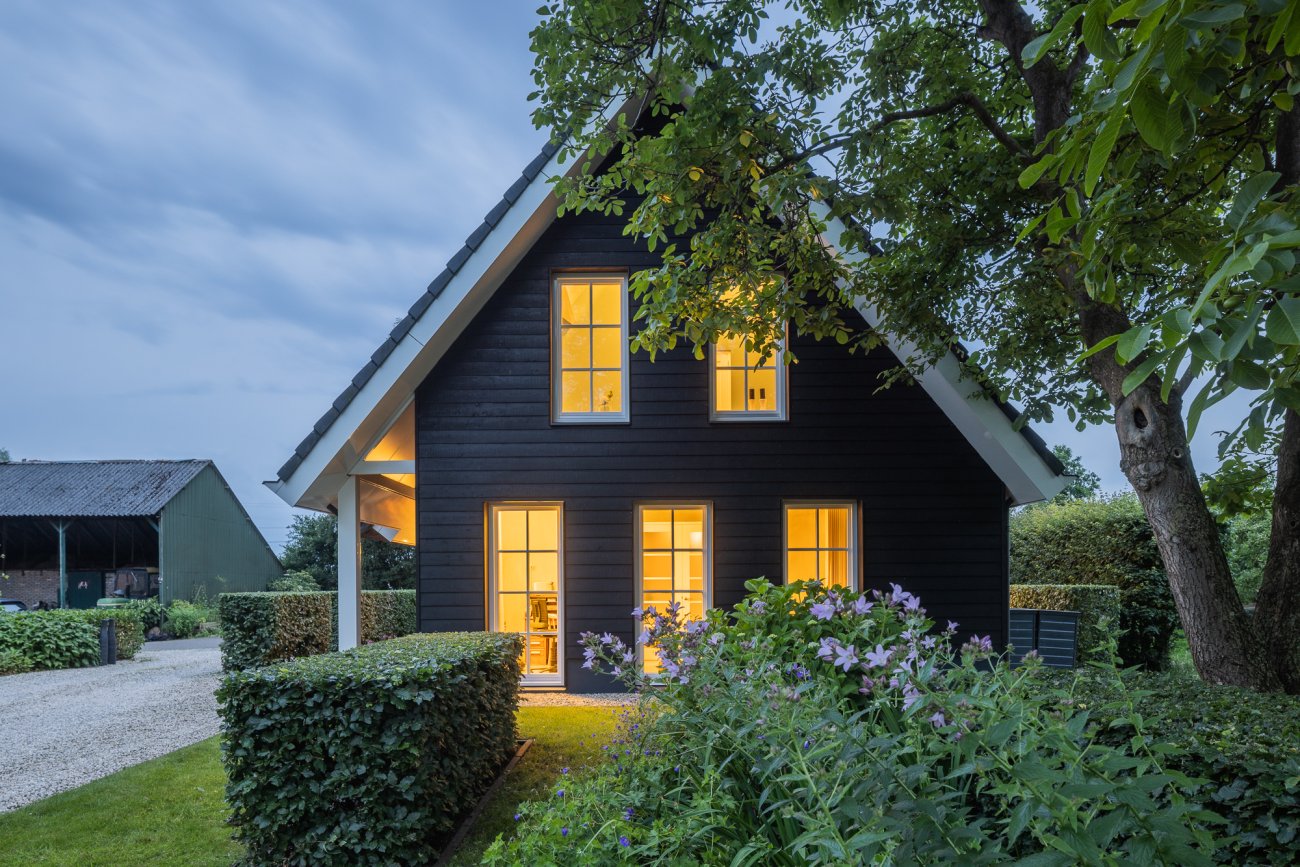 Door het gebruik van verschillende gevelmaterialen en dakbedekking wordt voorkomen dat de woning massief overkomt. Ook is er met de keuze in materialen een knipoog gemaakt naar het verleden waar bij boerderijen regelmatig een duidelijk voor- en achterhuis zichtbaar was.